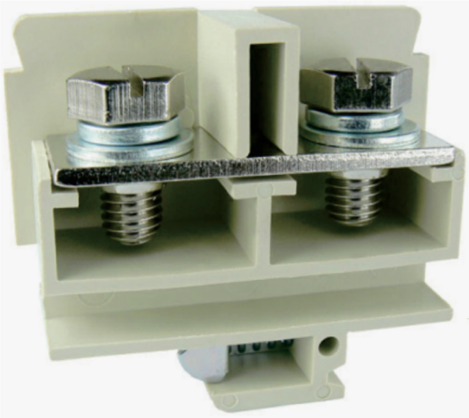 接线端子,额定电压:660V,最大工作电流:101A,接线方式:螺钉连接,连接量:2,压线范围:10mm²-16mm²-25mm²,AWG:8-6-3,厚度21mm,高度49.5mm,颜色:灰色,安装方式:G32-15